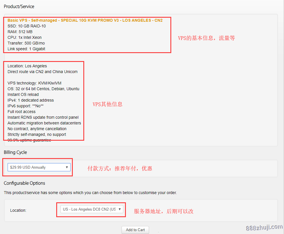 根据图示,我们需要查看并确认一下配置详情(一般都没有问题),然后选择付款周期和机房。付款周期建议选择年付(有些方案也只能年付),机房的选择,我们可以先在 搬瓦工数据中心页面对各个机房进行测试,选择最合适我们自己的,也可以先随便选一个,之后在KiwiVM后台自主切换(有些限定机房不能迁移的方案除外)。没有问题的话,就可以点击“Add to Cart”添加到购物车了。
