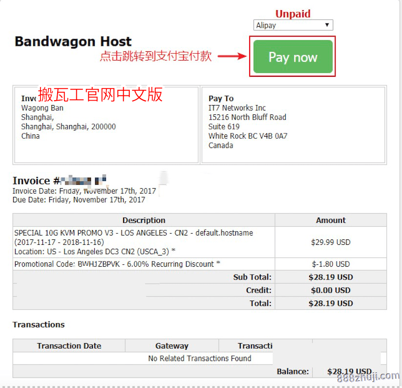目前搬瓦工已经支持支付宝付款,所以在点击“Complete Order”后,我们就会看到这个页面。然后点击“Pay now”就可以跳转到支付宝进行付款了。