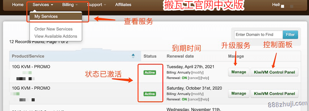 付款完成后,我们需要等待一分钟到半个小时(一般一分钟左右就好了),然后我们可以登录搬瓦工后台,就可以看到已经购买成功的VPS主机。之后我们可以登录面板进行使用。